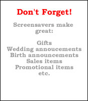 Custom Screensavers We can create a custom screensaver from your photos! Use these screensavers as unique gifts to family and friends. You can also use these screensavers as promotional items, giveaways, or even sell them as a download or CD! Our Custom Screensavers are built as an executable (.exe) installation file that is easy to run and install onto the users' computer. You can also control if the Screensaver is shareware or a full version. With the shareware version, the user will have a # of days to "trial" the screensaver before ordering or entering the registration key that can be provided with the screensaver/CD or ordered from your website. All this for the amazingly low price of $5.00! (up to 50 photos) Order Now!